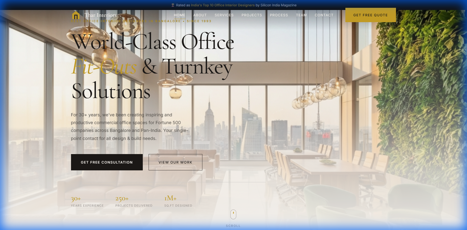 A stunning portfolio website for Thar Interiors, Bangalore's premier office interior design firm with 48+ years of excellence. The site features magazine-style editorial layouts, immersive project galleries, awards showcase, and a refined minimalist aesthetic that reflects their design philosophy of sophisticated simplicity.